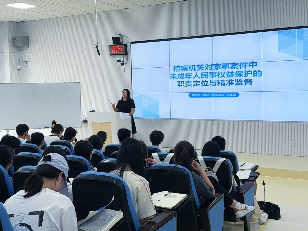 (英亚游戏平台 王紫微 刘媛 图文报道)9月9日下午,我校“三大论坛”之人文论坛、贵州省人民检察院“检察实务专家进校园”系列课程第二讲在乐学楼成功举办。本次讲座特邀贵阳市云岩区人民检察院检委会专职委员、一级检察官冯圆圆,以“检察机关对家事案件中未成年人民事权益保护的职责定位与精准监督”为主题进行授课,英亚游戏平台副院长宋昭澜主持讲座,百余名师生到场聆听、交流。