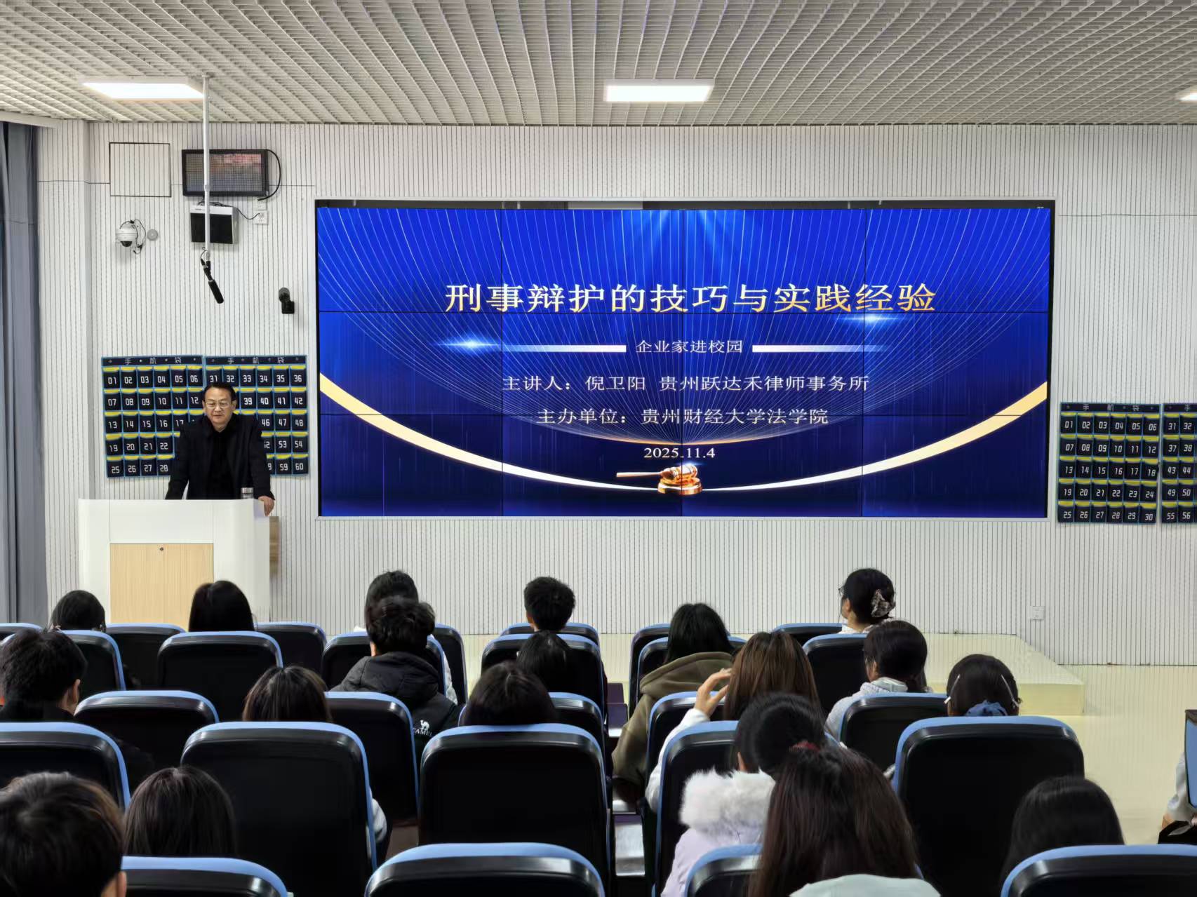 (英亚游戏平台 何德爽 报道|摄影 李嘉琪)11月4日,由英亚游戏平台主办的文化传承与创新之“企业家进校园”活动在进学楼103教室顺利举行。本次讲座邀请贵州省优秀律师、贵州跃达禾律师事务所副主任倪卫阳为主讲人,为全校师生带来一场“刑事辩护的技巧与实践经验”的专题讲座。讲座由法律事务俱乐部主席何德爽主持,全校120余名同学参加。